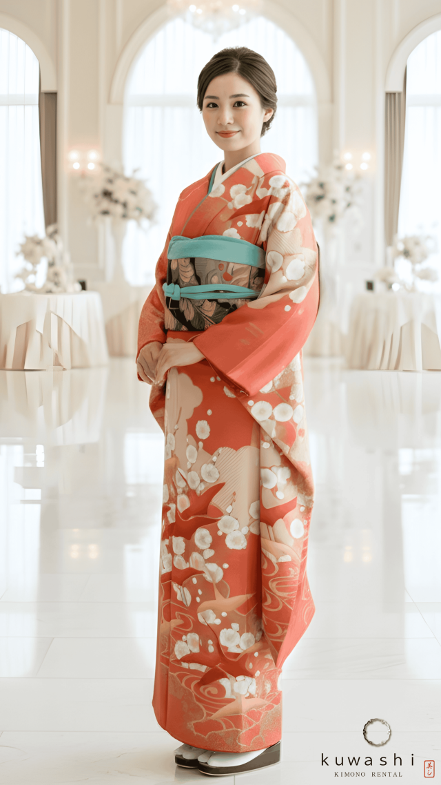 「 80027 朱赤地光琳鶴に梅正絹振袖袋帯セット 」